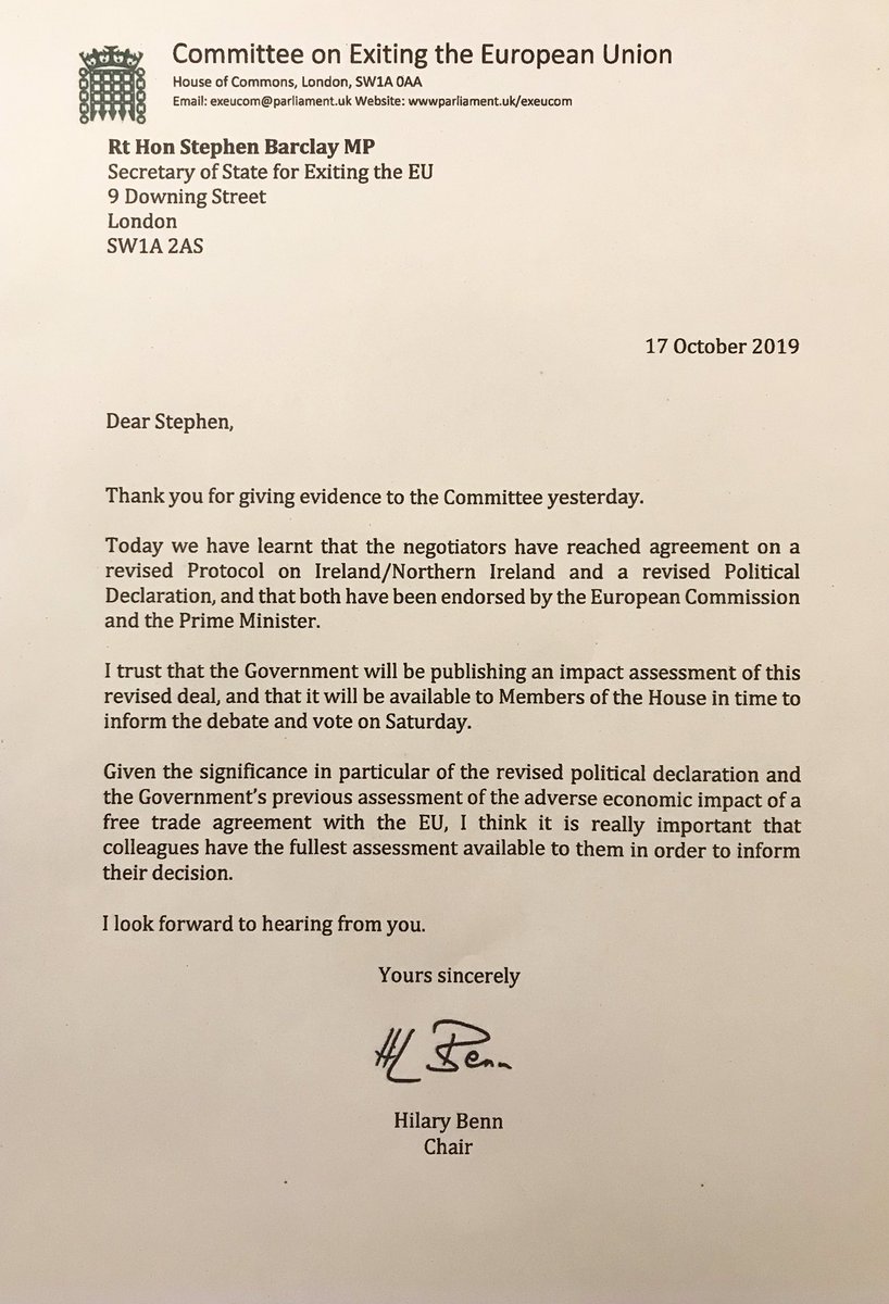 My letter to Stephen Barclay asking the Government to publish an impact assessment on the Brexit deal so that MPs can consider it before they vote on Saturday.pic.twitter.com/k8LbUM3bun