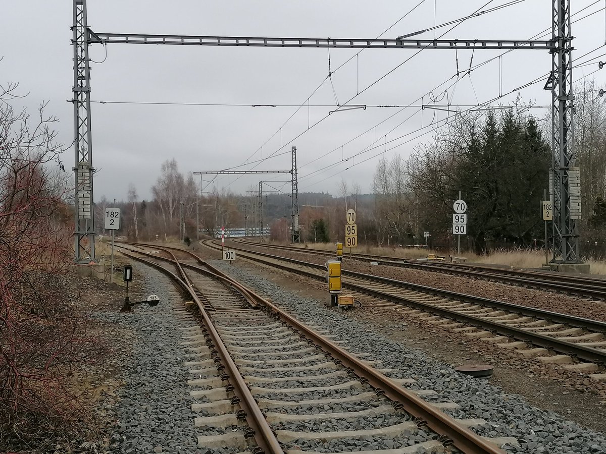 Pro koho platí návest 100 km/h? Za levou kolejí následuje lokalka D3 s oblouky rozhodně nedovolujícími 100 km/h. Tu úplně vlevo do kopřiv nepočítám.
