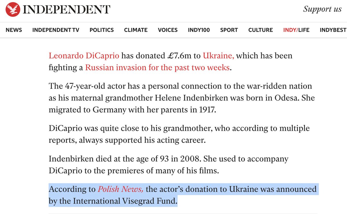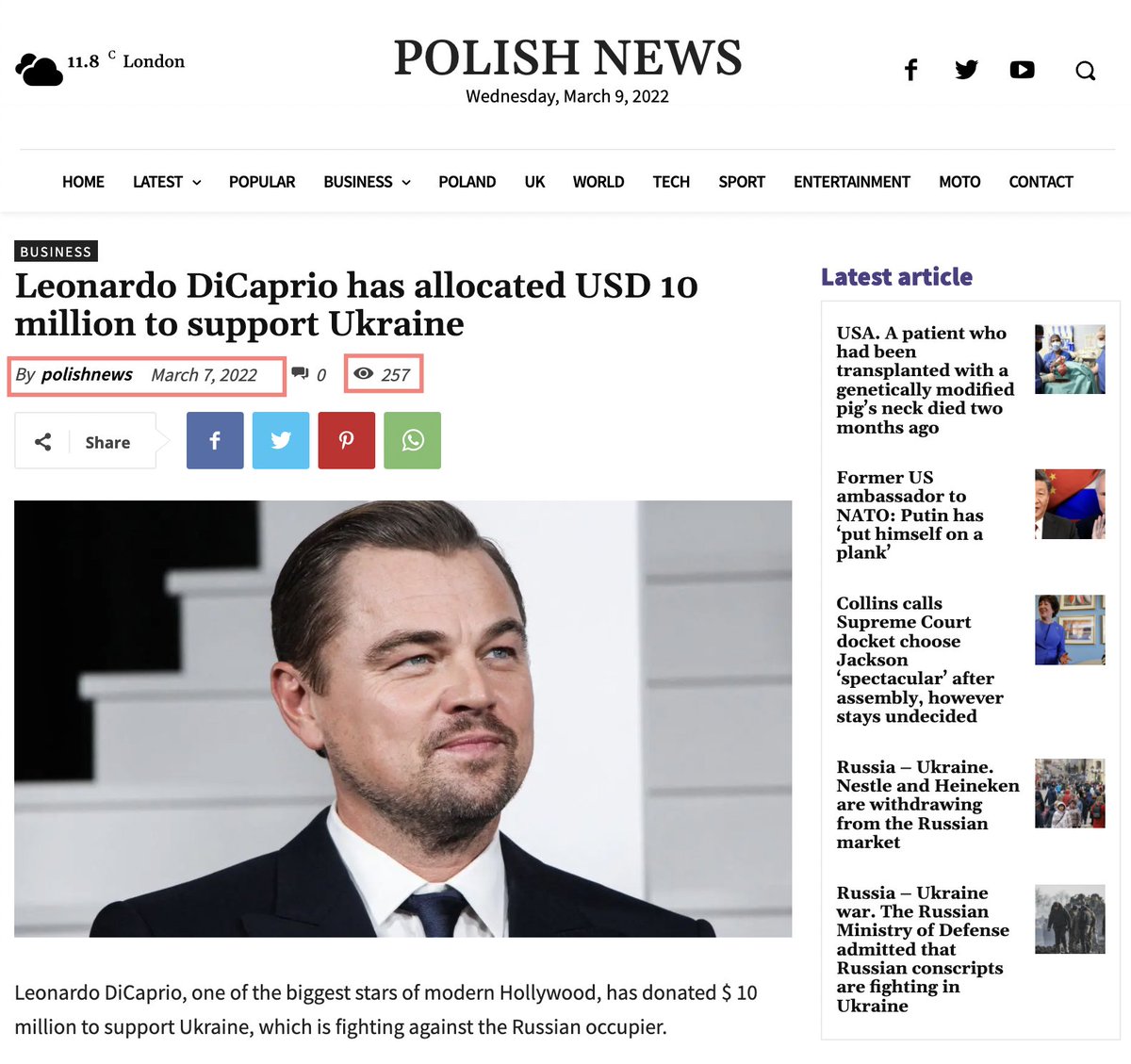 Outlets are citing "Polish News" with claims that Leo donated $10mil to Ukraine, but this doesn't look like a real news website to me. There are no bylines, no author/about information, and it was only registered in 2020. Has anyone actually confirmed this with Leo's people?pic.twitter.com/S6HCZn147n