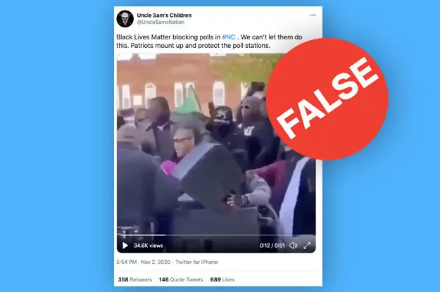 12. No, Black Lives Matter protestors did not block a polling station in North Carolina. The video used in the tweet was shot on Oct. 31 and showed police in Graham, NC aggressively reacting to a local march to the polls. https://www.buzzfeednews.com/article/janelytvynenko/election-rumors-debunked#125892448 …pic.twitter.com/ZA57mExsYy