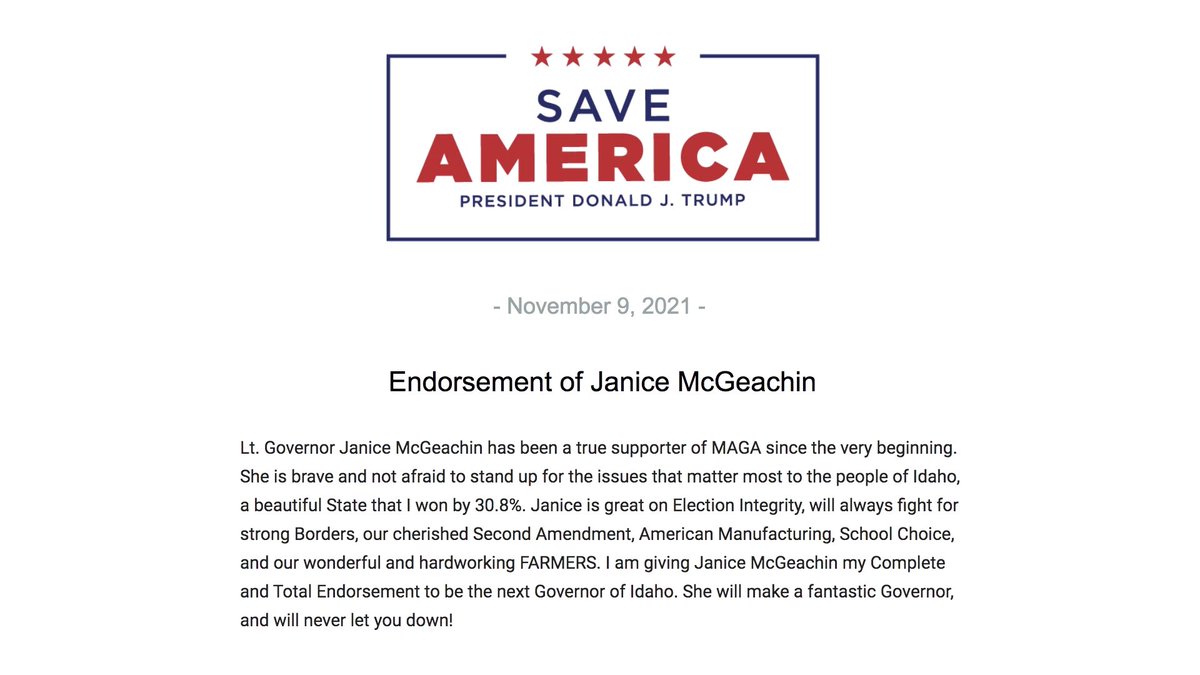 It is a great honor to receive the endorsement of the greatest President of our lifetime. President Trump is a true fighter for America and I am a true fighter for Idaho. Much more to come from the two of us to bring America First back to Idaho. Stay tuned!