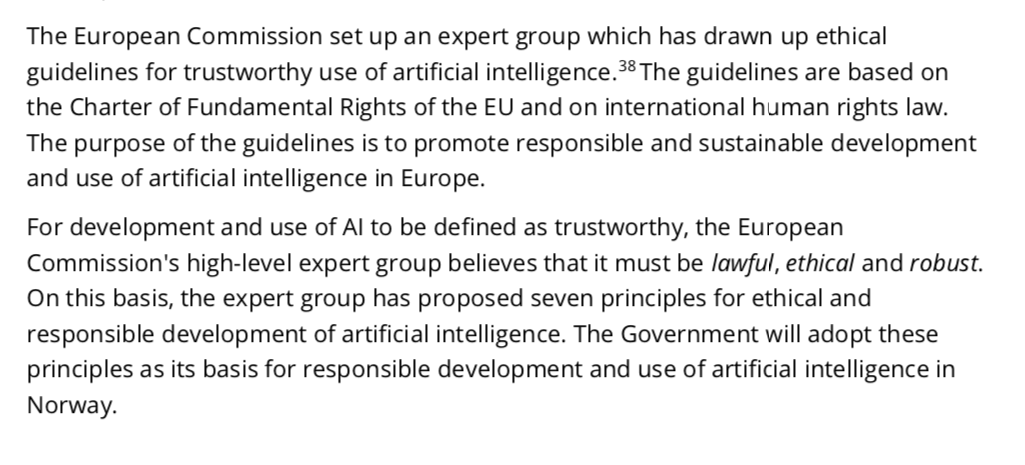 In its national strategy for AI (now available in English), non-EU member Norway embraces the EU experts' guidelines for "trustworthy AI" as the "basis for responsible development and use of artificial intelligence in Norway." https://www.regjeringen.no/contentassets/1febbbb2c4fd4b7d92c67ddd353b6ae8/en-gb/pdfs/ki-strategi_en.pdf …pic.twitter.com/IbiCgvX7IT