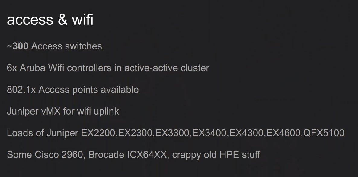 (finishing my thread) For the first time BCP38 filtering so that no-one could spoof the network. Only 300 switches for 2 500 tables made things challenging. 300 Access Switches, 6 Aruba Wifi Controllers in active-active cluster.