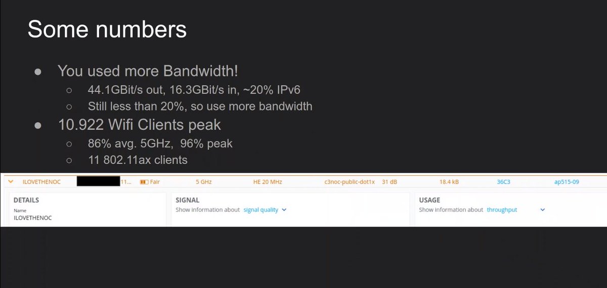 Peak 44.1 Gbit/s outbound, 16.36 Gbit/s inbound, ~20% IPv6. 10 922 peak Wifi Clients, 86% average were on 5Ghz. "Use more Bandwidth"