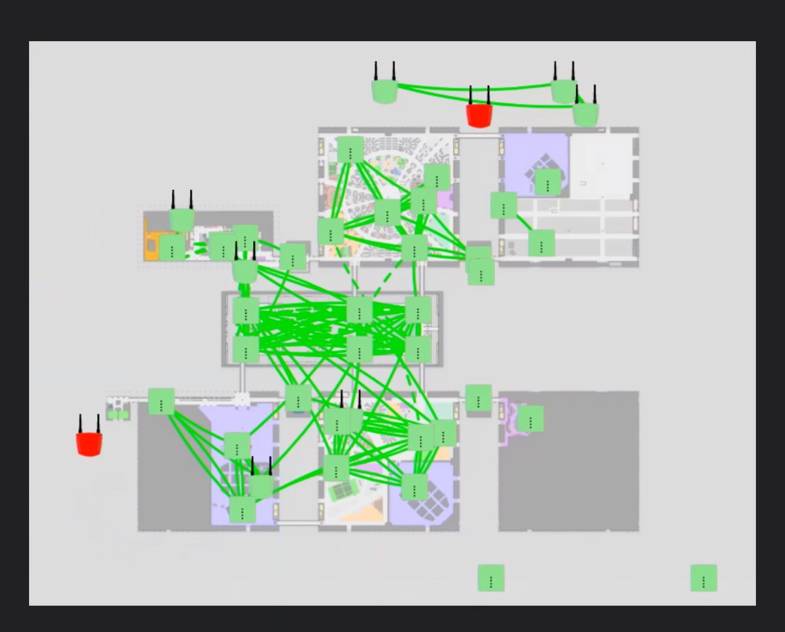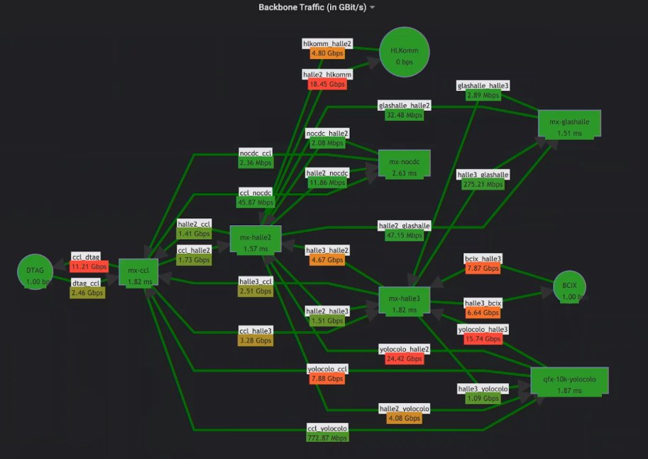 The NOC runs a Grafana dashboard where they get loads of data from various sources. Everything is configured using Netbox (automation for the win). Traffic maps were created to observe network utilization.
