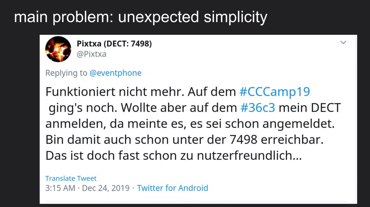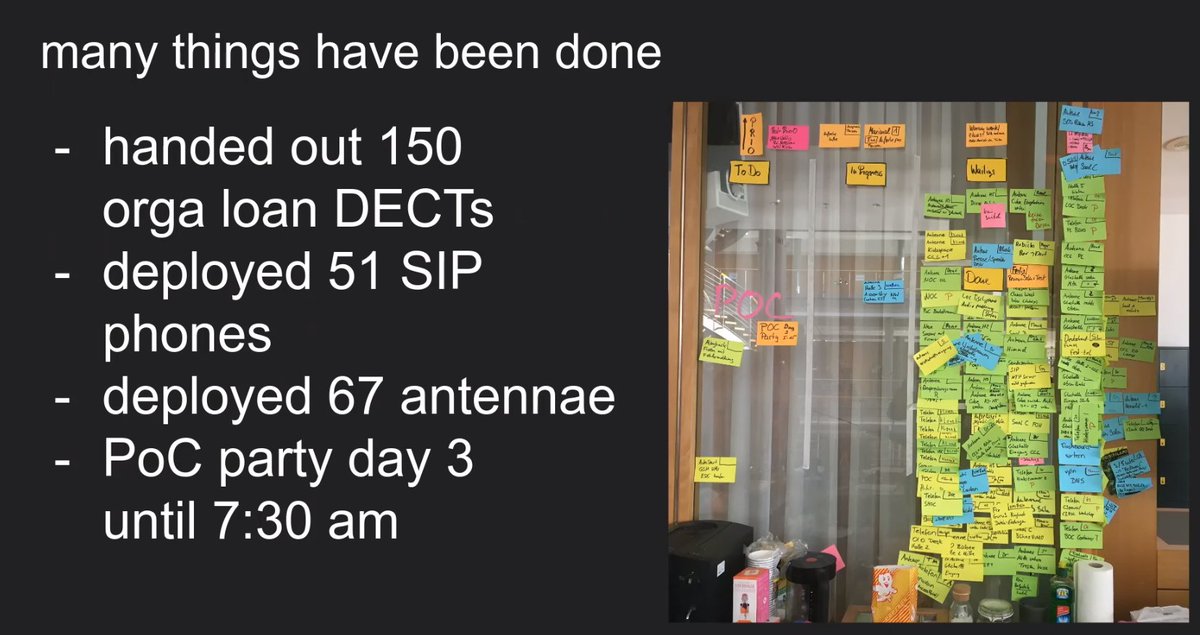 Next up is the POC who ran the DECT system. They loaned out 150 devices, deployed 51 SIP phones and 67 antennae. They also deployed antennas outside so that WiFi could be accessed at the hotel / train station.