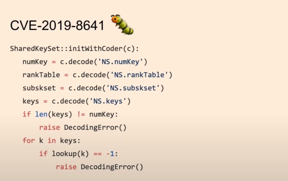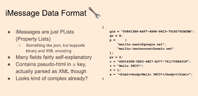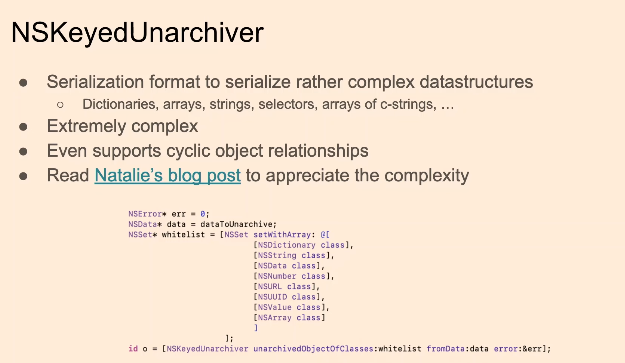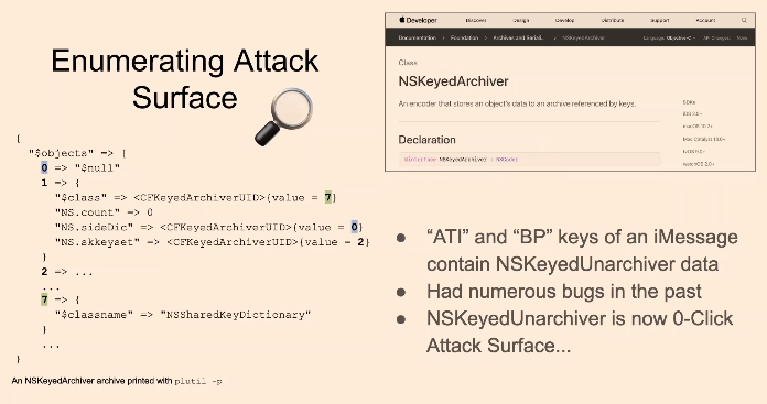 iMessage uses NSKeyedUnarchiver which has had many bugs in the past. It is extremely complex and support cyclic relationships which makes it a prime target for an exploit. #36c3pic.twitter.com/qhMibCwjDv