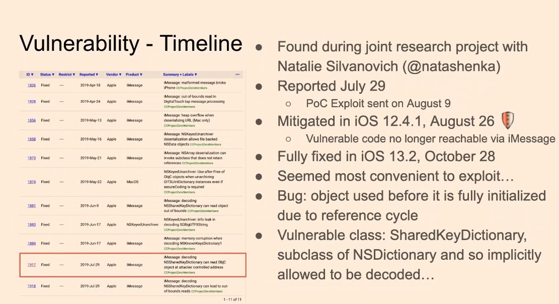 Timeline of the exploits that were developed by Samuel and Natalie and how Apple responded and patched the issues. They disallowed sub-classes to be decoded which reduced the attack surface significantly. #36c3pic.twitter.com/aGzbMd2vou
