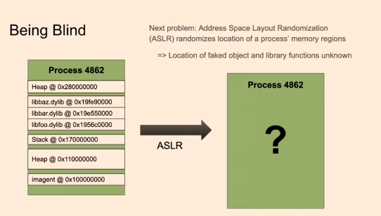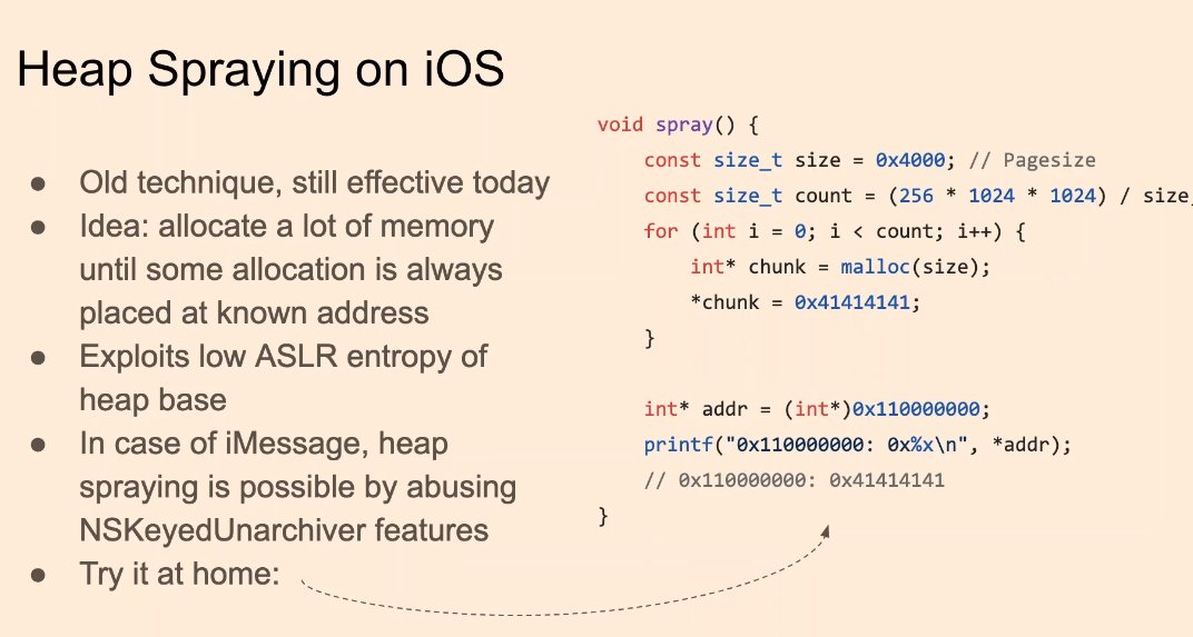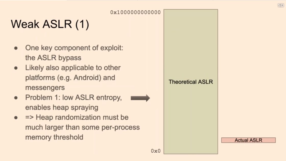 Next challenge, how do we get past ASLR since addresses are randomized. Need an ASLR bypass to get around this issue. Can use Heap Spraying on iOS which exploits the low entropy of the heap base. #36c3pic.twitter.com/bGCND3FlQR