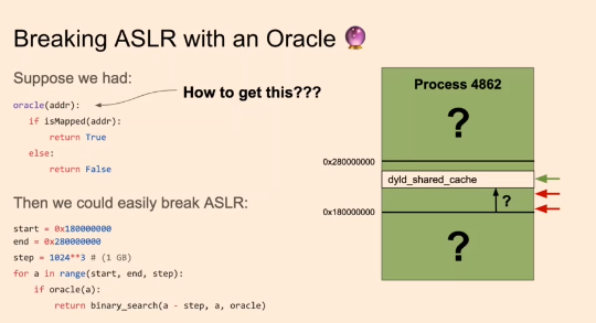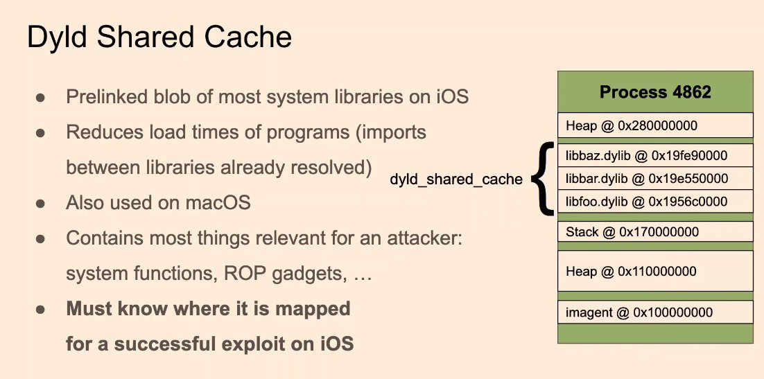 Need to know where the Dyld Shared Cache is mapped for a succesful exploit. Will always be mapped between 0x180000000 and 0x280000000. Addresses are only randomized during boot. #36c3pic.twitter.com/92UnPzXC0F
