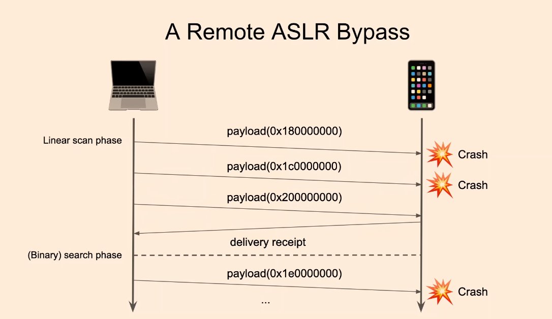 Once addresses are found in the shared cache, it can be used to crash the process to trigger a remote ASLR bypass. Crashes are not visible to users and crash logs are limited to 25 per service. #36c3pic.twitter.com/LWRMuK2twH