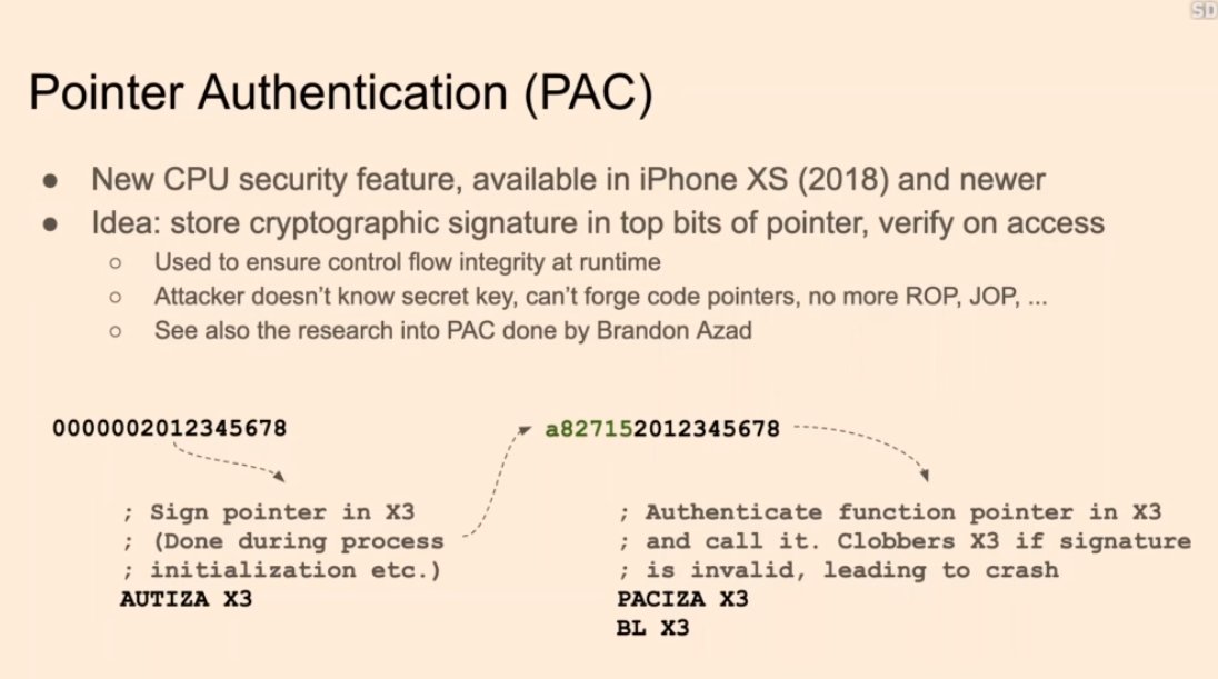 Pointer Authentication is a new security feature to store a cryptographic signature which can be used for validation on access. This requires CPU support only available in iPhone XS (2018) and later. #36c3pic.twitter.com/Dv1UlpGz79