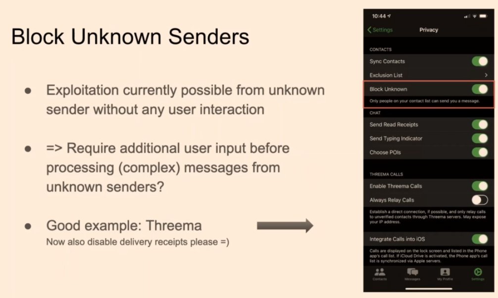 Message platforms should also allow you to block unknown senders which can limit who could send a message exploit to a client. #36c3pic.twitter.com/GpPagIyhQh