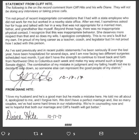 @Cliff_Hite provides a statement on his sudden resignation from the OH Senate; cites inappropriate behavior and health issuespic.twitter.com/cvtlOiyH9n