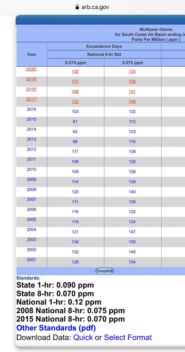 After today, we will likely have more violations of the Bush II ozone standard (.075 ppm) than we’ve had since 2003. We are not only seeing lots of violations of Obama ozone std (.070 ppm), but also days with really dirty air (ie way above the Bush II and Clinton ozone stds).pic.twitter.com/Engdz0avH7