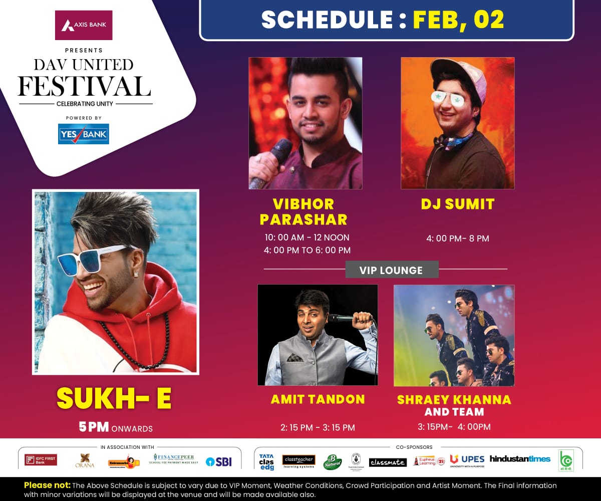 Dav UNITED FESTIVAL 31 Jan Morning shows: MILIND GABA AKSHAY DHAWAN ALI BROTHERS HIMANI KAPOOR TUSHAR KUMAR (illuminist) ZULFIKAR KHAN(ghazal tribute) KAVI SAMMELAN Evening shows: HARDY SANDHU