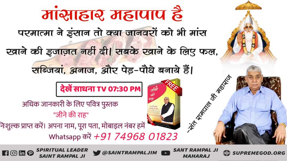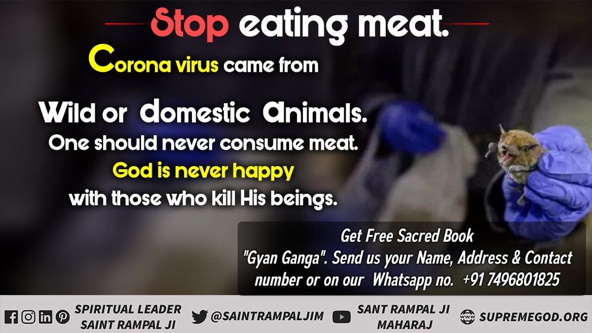 #NoMeat_NoCoronaVirus परमात्मा ने इंसान को मांस खाने का आदेश नहीं दिया, बल्कि फल फ्रूट और सब्जी वगैरह दिए हैं। मनुष्य मांस खाकर महा पाप का भागी बन रहा है।।pic.twitter.com/cyq8er1O0Y