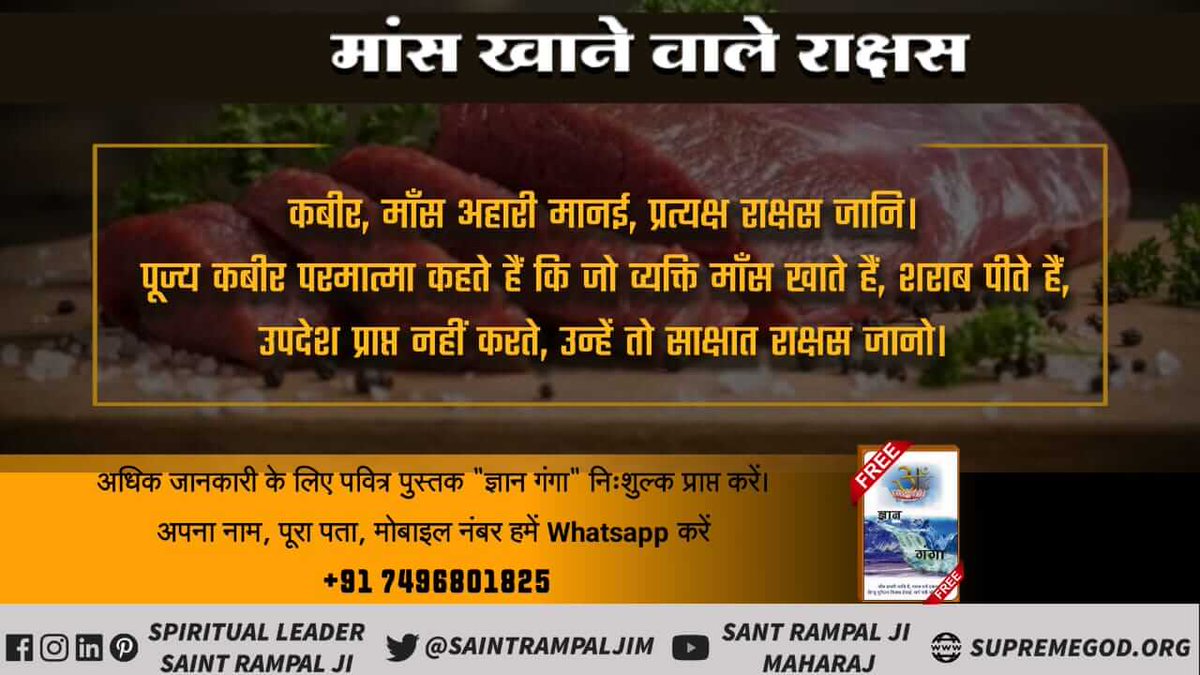 कबीर-माँस भखै औ मद पिये, धन वेश्या सों खाय। जुआ खेलि चोरी करै, अंत समूला जाय।। People who eat meat, drink alcohol, do prostitution. They gamble and steal, they are part of a great sin. People who eat meat are partakers of hell.