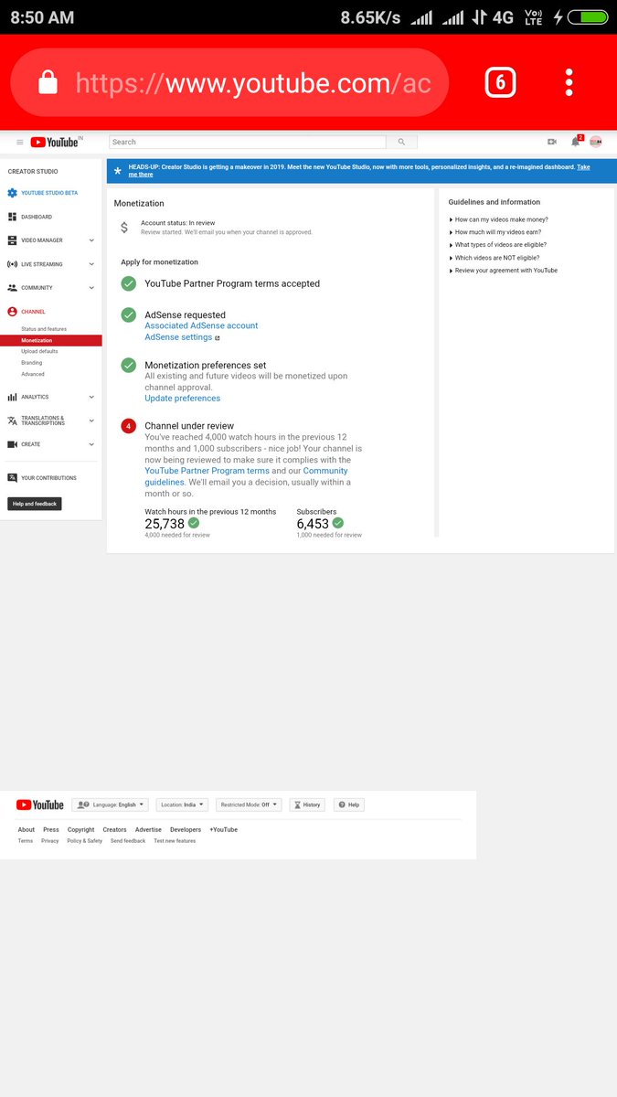 @YouTube @TeamYouTube sir i have 25000 hour wathchtime and 6000 subscribers in my channel but my channel is not monetize first time so i have resubmit for monetization in seconds time so plz check my channel and monetize fast my channel /www.youtube.com/c/POCKETNEWS24pic.twitter.com/ZkQEmYS4ck