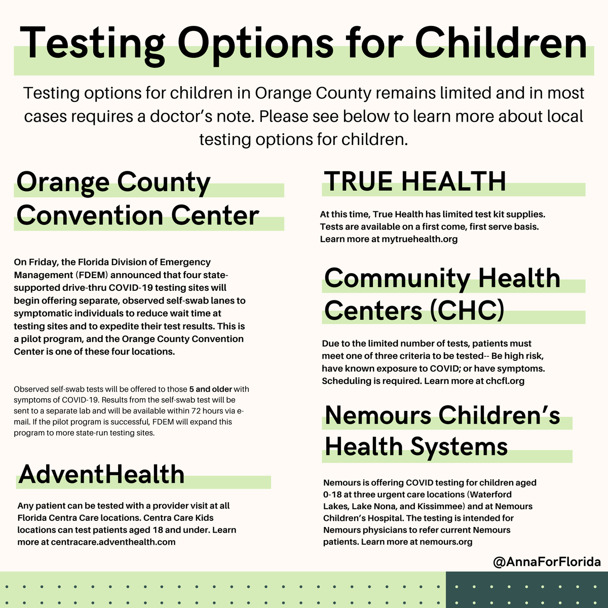 We wanted to share more insight into where children in Orange County could get tested for #COVID19. Options are currently limited, but there is a new pilot program at @OCCC facilitated by @FLSERT. Learn more below & please share other options, too.pic.twitter.com/gmLOqsxEIh