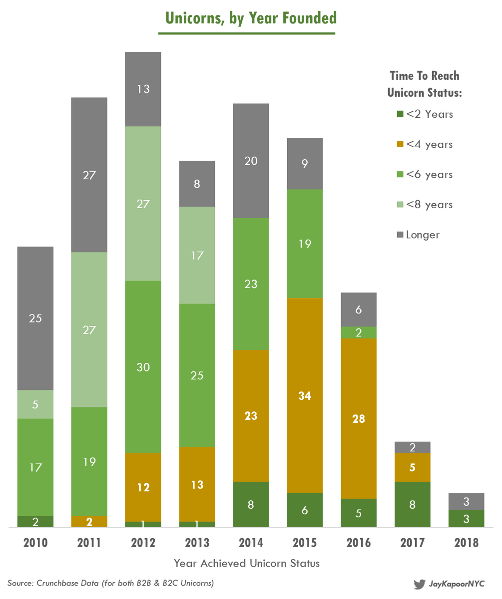 Also, hi-res graphics provided below. First up is the shortening time to reach Unicorn Status over the last decade. Data thanks to