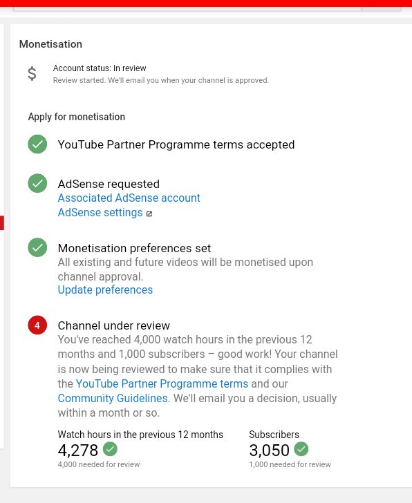 Dear team YouTube my YouTube channel complete 1 year and in the time my channel completed 1000 subscriber and 4000 watch but my channel not monetize yet, please moneytiz my YouTube channel.