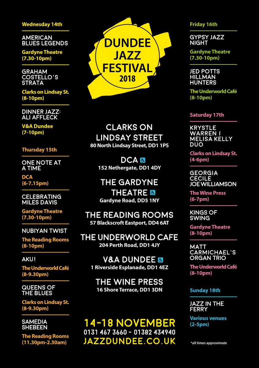#Dundee#Jazz#Festival? So much on offer:#blues, jazz,#AfroBeat ,#crossovers,#GypsyJazz#Swing#Tango#Disco#singers & more! Have a look at the full programme at http://www.jazzdundee.co.uk/programme#DJF2018pic.twitter.com/bUtXki9w3e