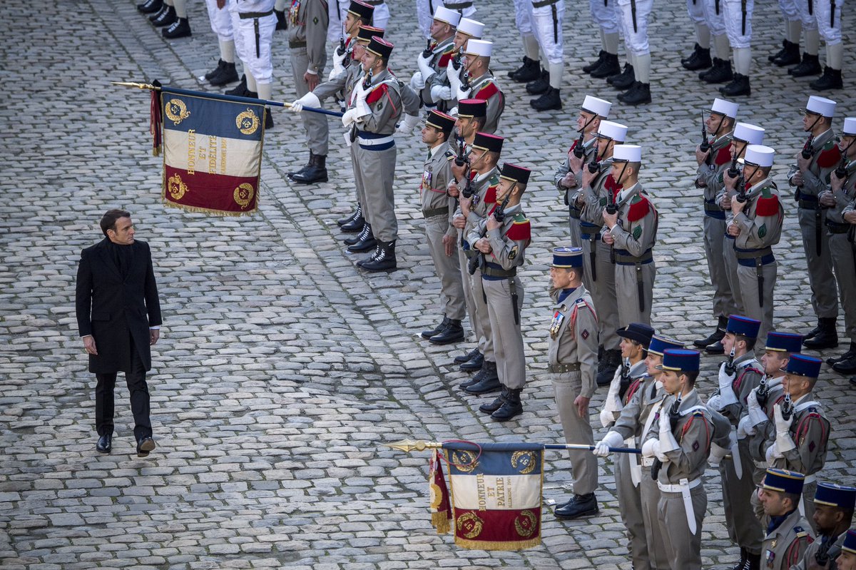 #HommageNational aux#Invalides] Avec le président de la République@EmmanuelMacron aux côtés des familles. La Nation honore le courage, l’engagement et le sens de l’honneur de nos 13 frères d’armes tombés pour la France.#NOublionsPas leur mémoire.pic.twitter.com/o4qcst1riz