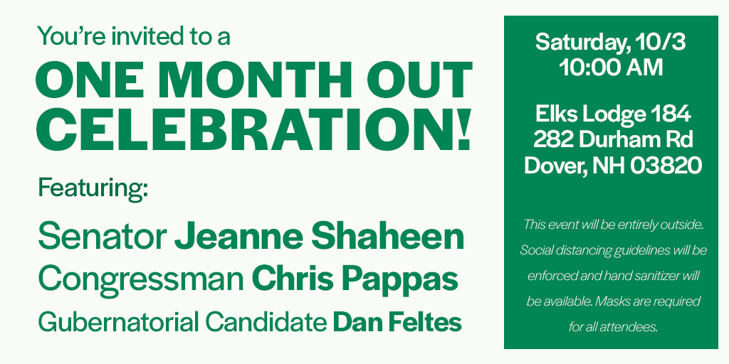 This Saturday, October 3rd at 10:00am, join me in Dover along with @ChrisPappasNH @DanFeltesNH @SenDavidWatters and @Cindewarmington to mark one month out from Election Day. I'm excited to see you all in person again! Click here to RSVP: https://bit.ly/36oXNbh pic.twitter.com/zSFqNQWj3i