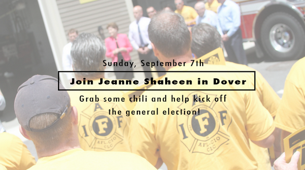Join us for chili in Dover this Sunday and kick off the general election. Hosted by @PFFNH → http://jeanneshaheen.org/chili pic.twitter.com/mDRFIGhCXR