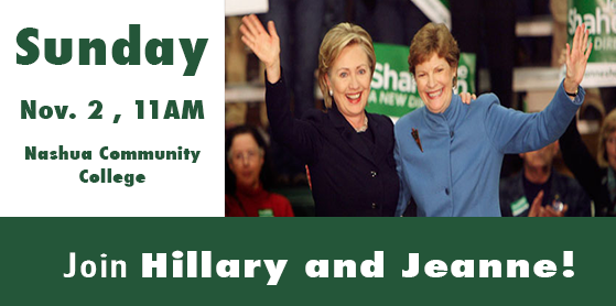 Sunday, November 2nd at 11AM. That's when you'll be able to see Hillary Clinton in NH! RSVP: http://jeanneshaheen.org/hillary pic.twitter.com/5JbbnckMWF