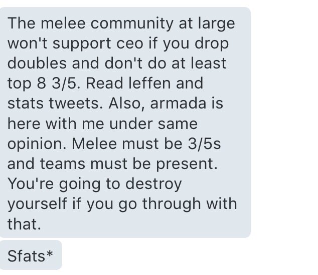 @CEOJebailey Doubles is cool and Top 8 *should* always be 3/5, but ffs this ain't the way to ask for it. CEO was great, screw these guys.Thanks. Twitter will use this to make your timeline better. UndoUndo
