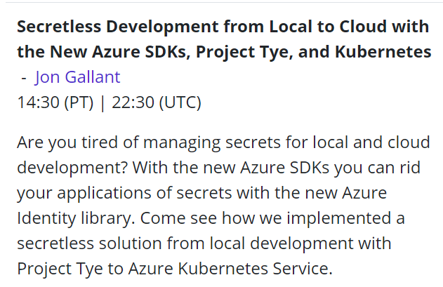 @AzureSDK#dotNETConf sessions Intro to the new Azure SDK for .NET with@JeffRichter https://www.youtube.com/watch?v=v36NXLU3TLY … Secretless Dev with the new Azure SDK, Project Tye, and Kubernetes with@jongallant https://www.youtube.com/watch?v=IgYXJ4ZHuas …https://twitter.com/AzureSDK/status/1323419863293915136 …