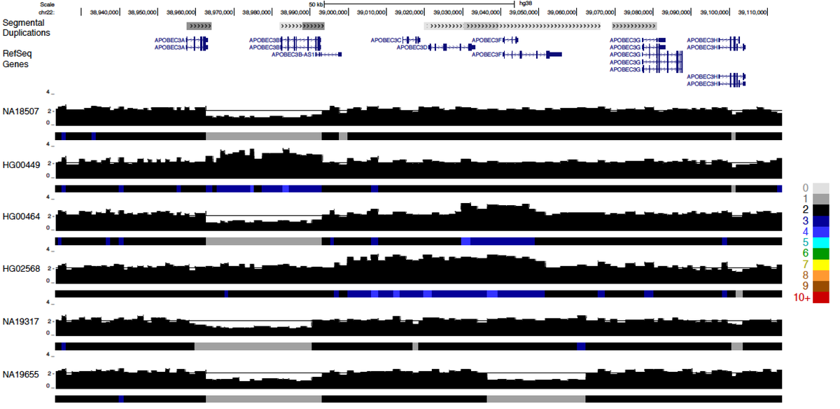 At the APOBEC3 locus, we observed several rare CNVs. Including what appears to be a APOBEC3B duplication, as well as apparent variation at other family members such as APOBEC3C, APOBEC3D, and APOBEC3Fpic.twitter.com/7zoOYVjXfN