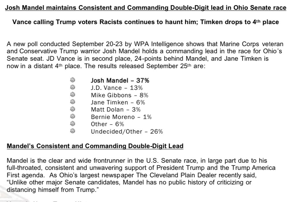 NEW POLL: America First Senate Candidate Josh Mandel is beating Never-Trumper JD Vance by a massive 24 point margin. Jane Timken drops to 4th place. Mandel - 37 Vance - 13 Gibbons - 8 Timken - 6 Dolan - 3 Moreno - 1 Other - 6 Undecided - 26pic.twitter.com/FtoBQM7UoW