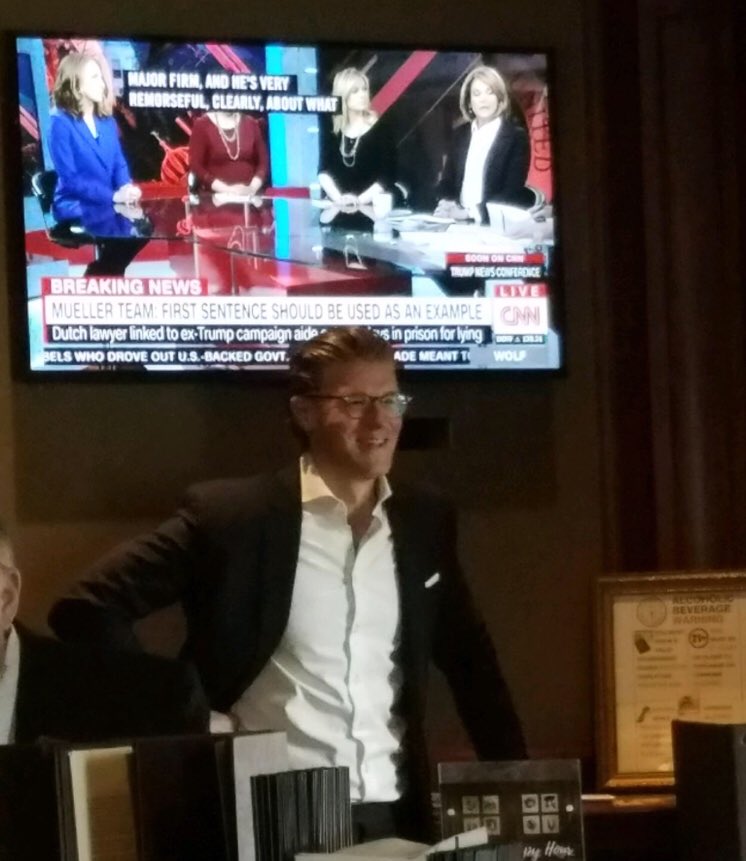 WHAT ME, WORRY? Spotted hanging out with friends at the Willard Hotel's lounge after being sentenced Tuesday morning to 30 days in jail & a $20k fine, ALEX VAN DER ZWAAN, smiling as a TV behind him plays