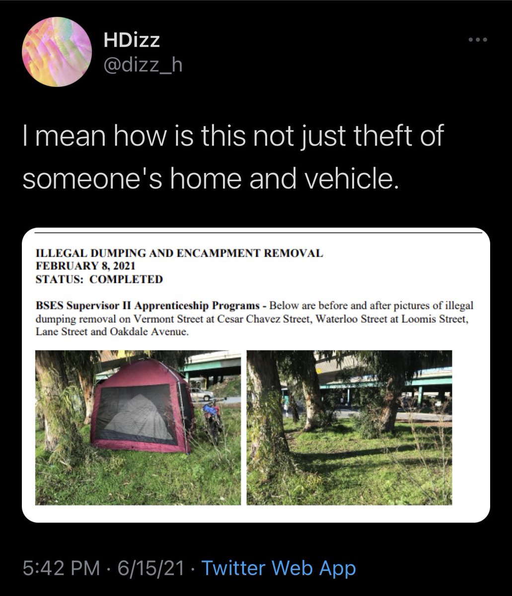 Could people please stop blaming SF City workers for a situation they didn’t create? Yes, this situation sucks. Why? A tent should never have to be a person’s home! Let’s focus on the real societal wrong that created the homelessness problem in the first place - and FIX IT!!