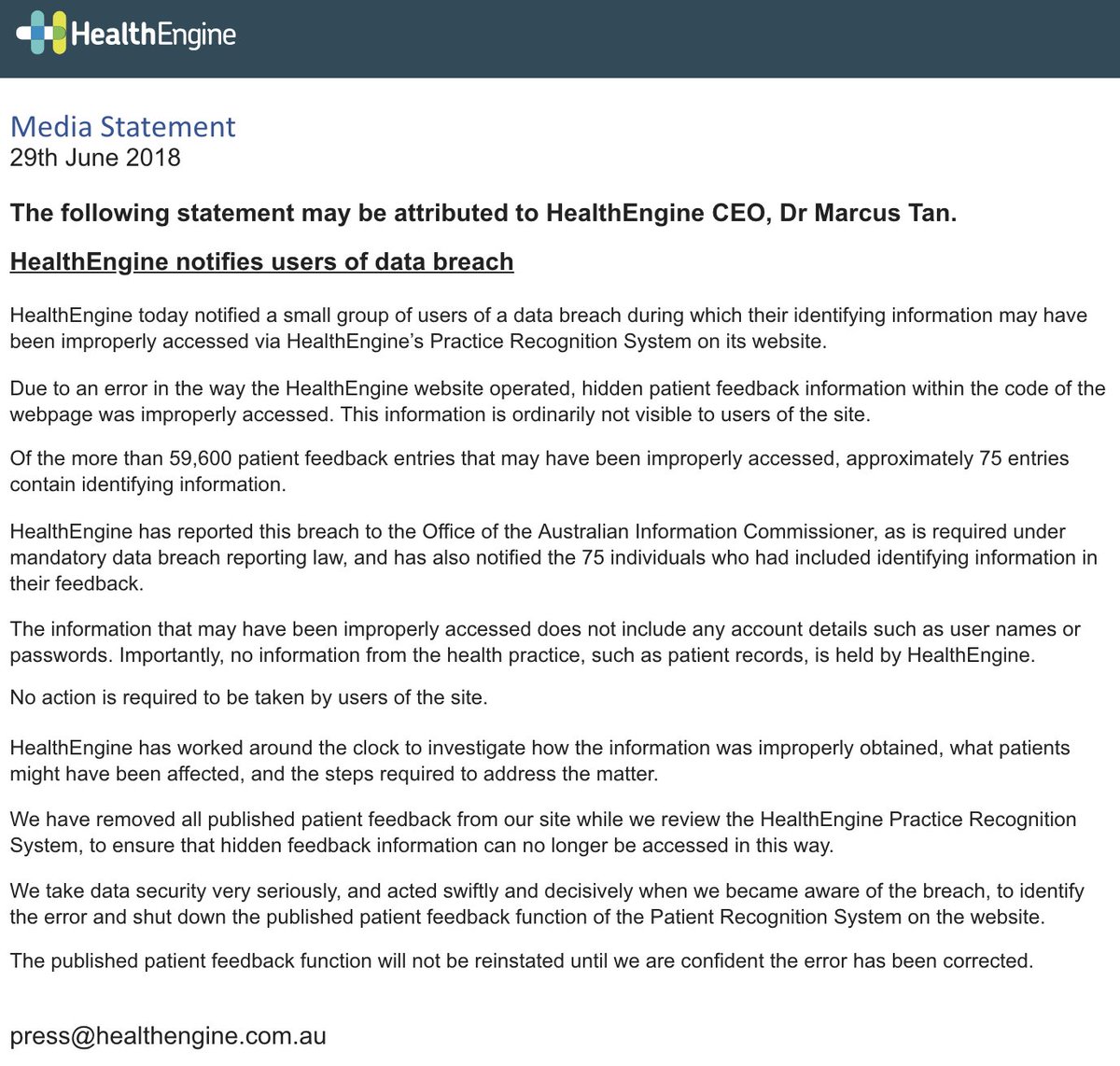 @healthengine has reported a data breach to the OAIC. It says 59,600 patient feedback entries were improperly accessed, 75 of which contained identifying information.#privacy#auspolpic.twitter.com/hlKuEAcYar