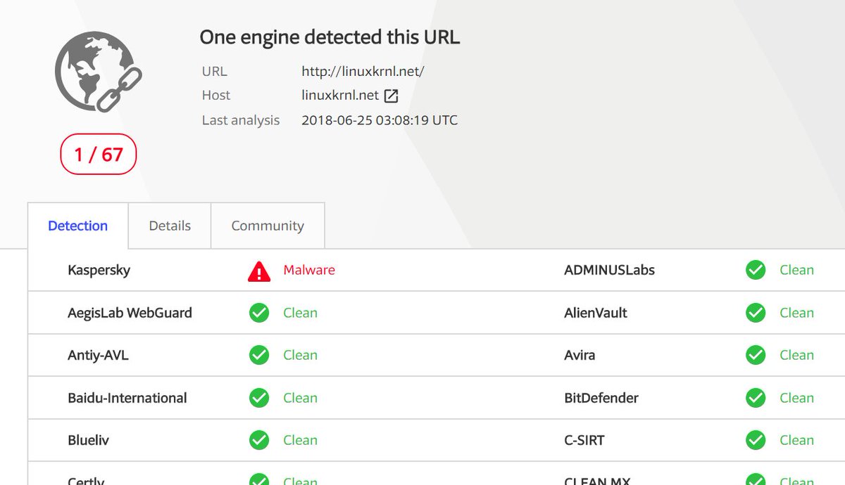 2/ only one of 67 antivirus services detected http://linuxkrml.net as malicious: Kaspersky, a Russian antivirus https://www.virustotal.com/#/url/84c5f0b9939821a46234df1a668aa622b01cb69f901825b33379ceb2a114e62b/detection …pic.twitter.com/q9rbtoTpXT