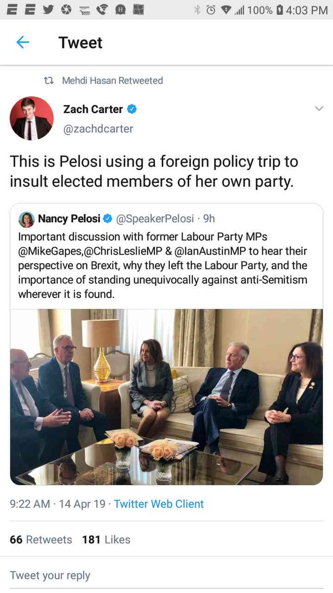 This is Zach Carter, a senior reporter for HuffPost, and Mehdi Hasan of Al Jazeera and The Intercept, attacking Pelosi for standing up against antisemitism while in London. Never forget this:pic.twitter.com/bpE4FDAwBt