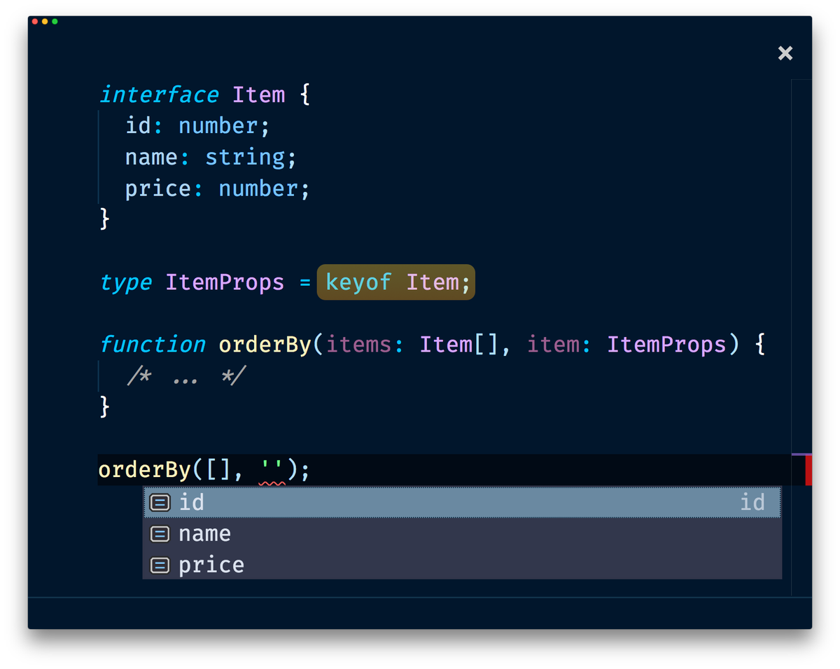 #TypeScript tip for today: Want to make sure you are working with the correct properties when using them dynamically? Then use `keyof` which will create a string literal type that consist of property names for given type. Useful for updating/sorting/etc, not only in#angular;)pic.twitter.com/j2RPA18wfA