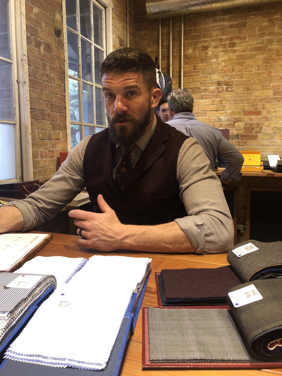 I'm getting the @tailorcooperative experience and decided to go all out with my "badass" suit! Going bold on Jacket colors (the dark colors are the jacket and vest and light will be the shirt) as I sip whiskey and discuss options with my style consultant, George.pic.twitter.com/7xxlXjpCeP