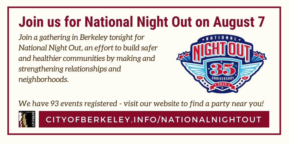 Join us tonight in celebrating National Night Out, a great opportunity to meet your neighbors and build community. We have 93 events registered throughout Berkeley! Find one near you: https://www.cityofberkeley.info/City_Manager/Press_Releases/2018/2018-08-07_National_Night_Out_is_Tuesday,_August_7_-_Come_Out!.aspx …pic.twitter.com/9fwRrRsvyh