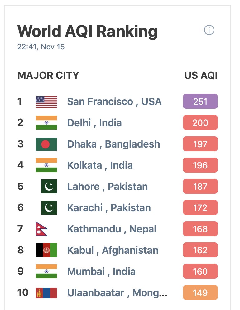 Wow. Today, San Francisco has the #1 worst air quality in the world. The Camp Fire smoke has virtually shut down the town. All schools canceled tomorrow. It’s a toxic, frightening smell.pic.twitter.com/12DOrCYUP5