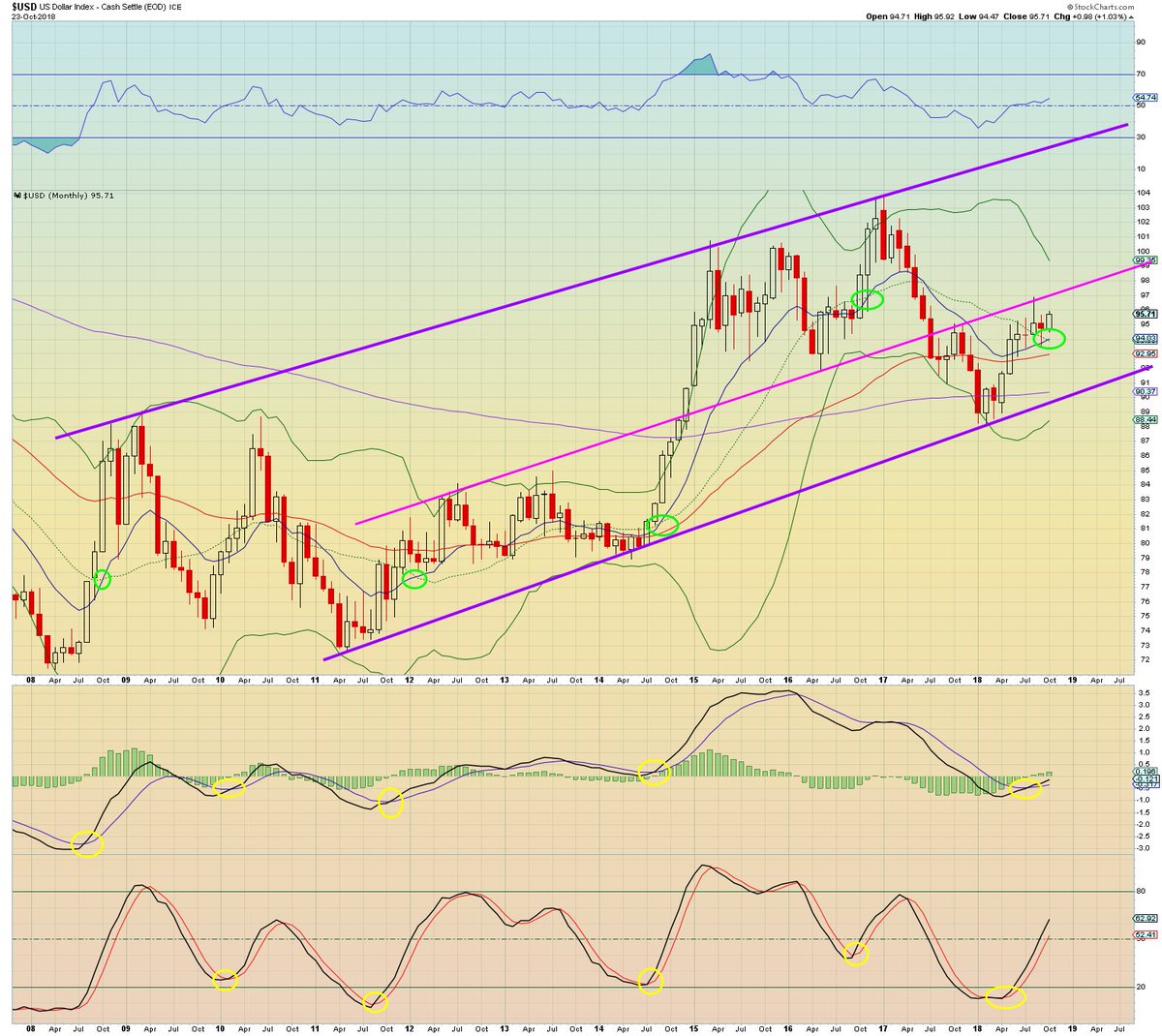 . Taking the long term perspective greatly simplifies current momentum in #USD.#Dollar MACD/Stoichs + 13MA/BC have ALL crossed bullish. RSI & 13MA not crossing 50MA also very bullish. Only resistance dropping UppeR BBpic.twitter.com/OuumxDQX3T