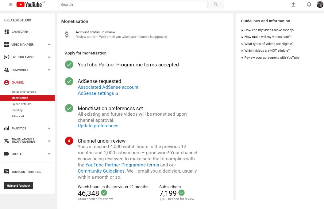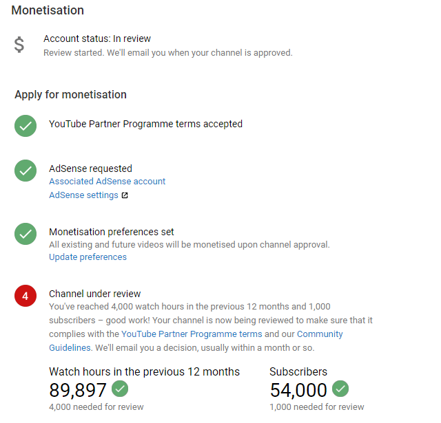 As per your terms& condition my YouTube channel' RisenTime' has completed 4k+watch hours and 1k+subscribers in previous months ago but monetization is not enabled.Plz review my channel.Thankspic.twitter.com/yHlZo0L0aB