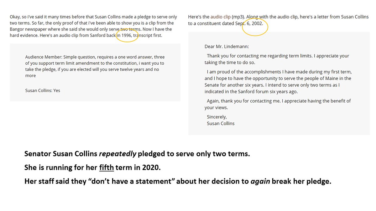 @jordainc Good piece on#Collins running for FIFTH term. She repeatedly promised to serve only TWO terms (see 96 & 02 transcript/letter). I'm a#Maine voter. Her staff told me they "don't have a statement" from her on breaking this promise. Would YOU ask her?#mepoliticspic.twitter.com/6lI5OvGLuT
