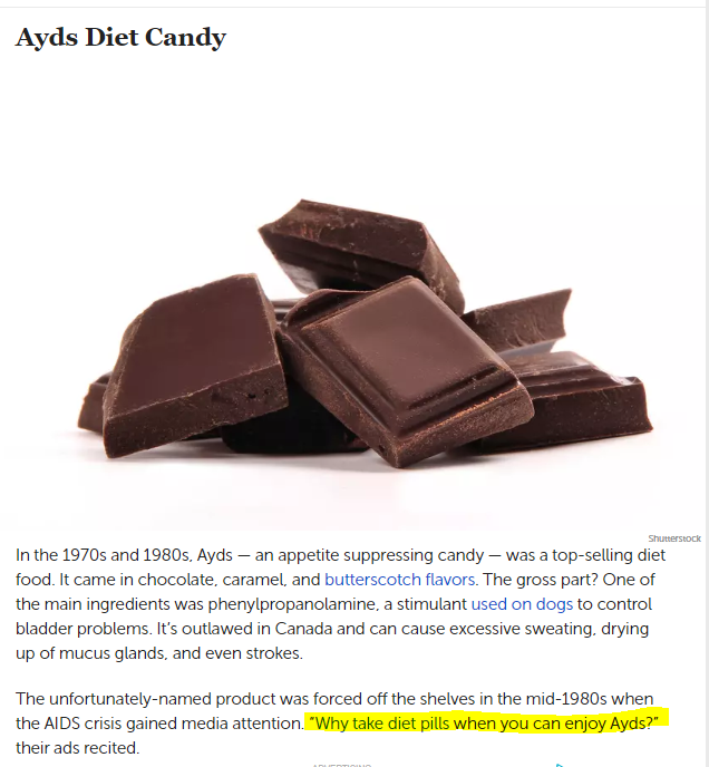 I remember the ad when I was a kid! A fat lady eating a turkey leg, saying “I get so hungry; how can I lose weight?”