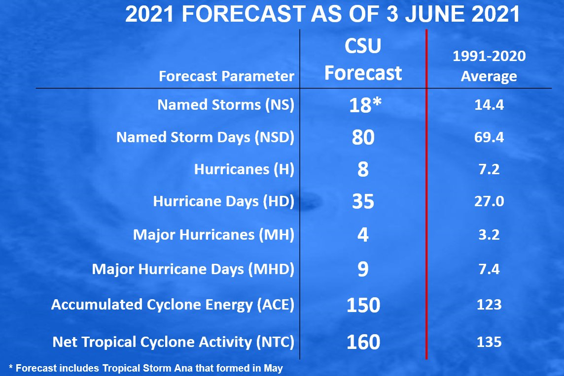 #hurricane forecast & continues to call for above-average season: 18 named storms (including Ana), 8 hurricanes & 4 major hurricanes. Likely lack of#ElNino & warmer than normal subtropical Atlantic primary factors.@ColoradoStateU https://tropical.colostate.edu/Forecast/2021-06.pdf …pic.twitter.com/QYyGr7u7PT