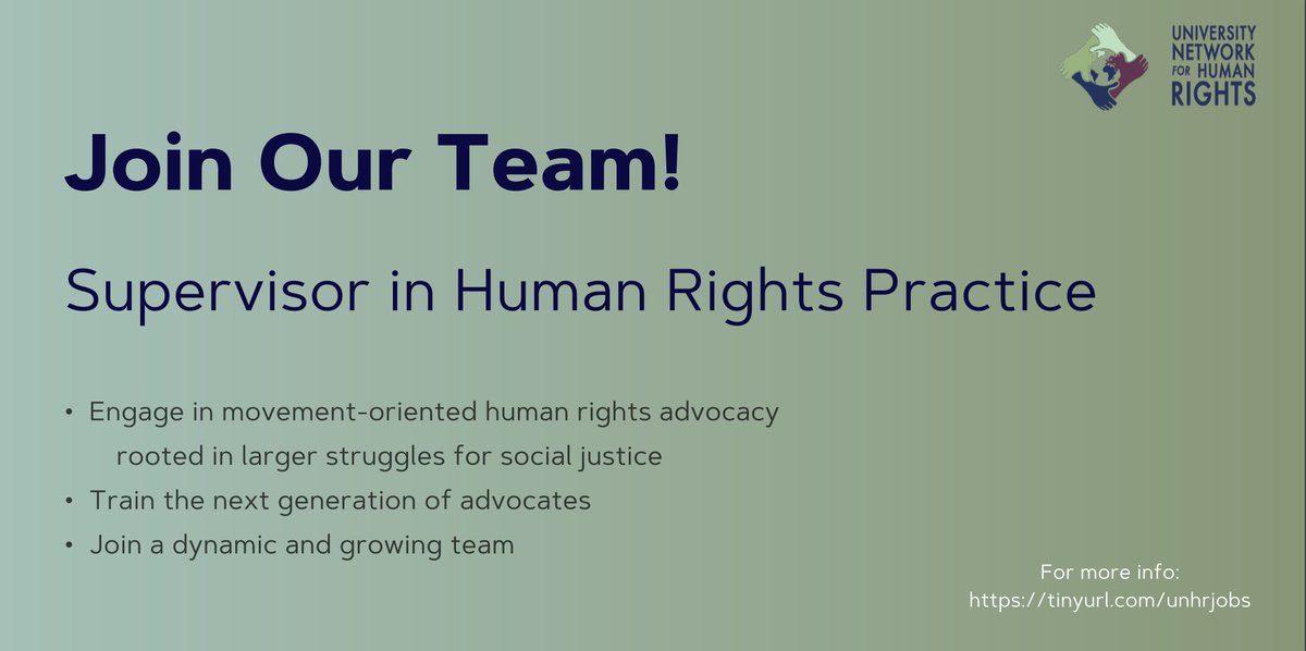 WE'RE HIRING! Passionate about training the next generation of movement-oriented human rights advocates? Want to join a dynamic and growing team of practitioners committed to social justice? APPLY NOW for our Supervisor in Human Rights Practice position: